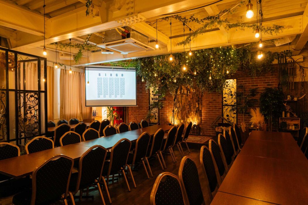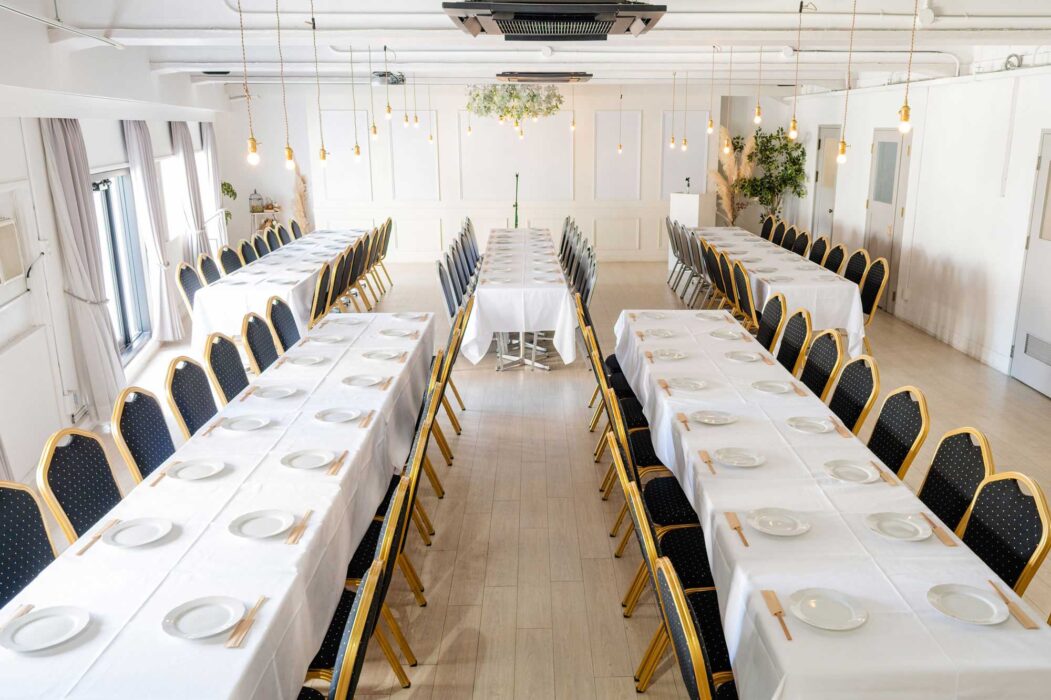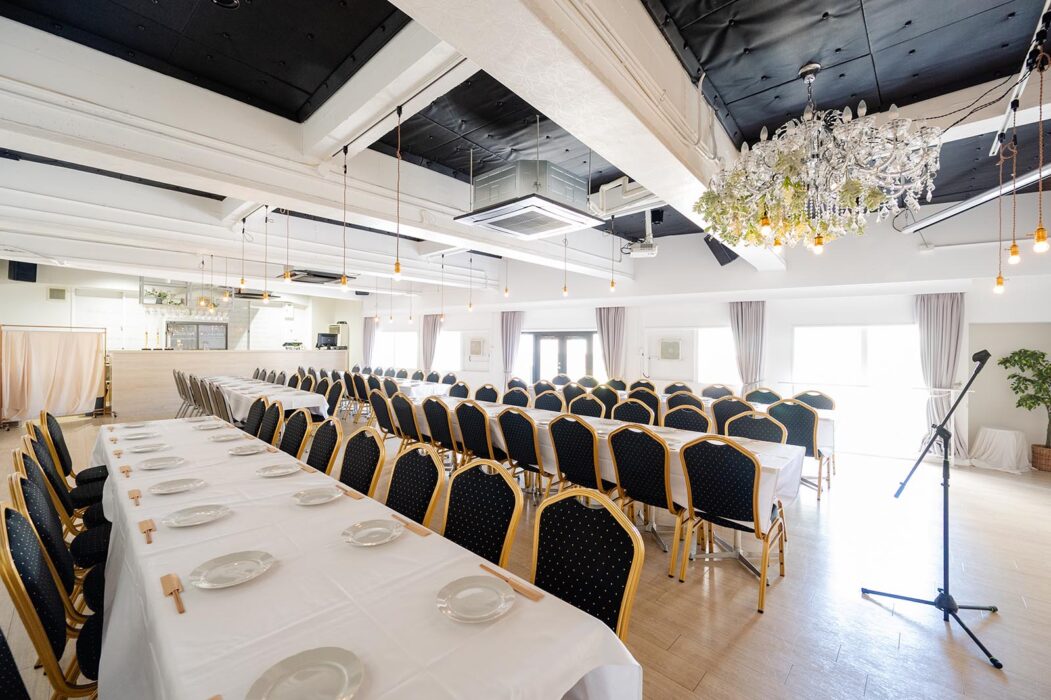 - 1F会場 最低保証人数 20名 最大収容人数(着席)40名(立食)30名〜50名・2F会場 最低保証人数 40名 最大収容人数(着席)80名(立食)50名〜100名